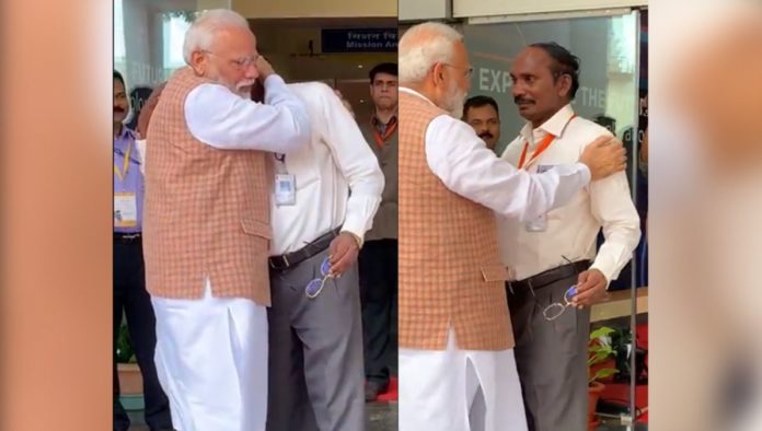 The visuals of the moment, widely shared on social media, showed PM Modi hugging and patting Mr Sivan as he broke down at the ISRO headquarters in Bengaluru.